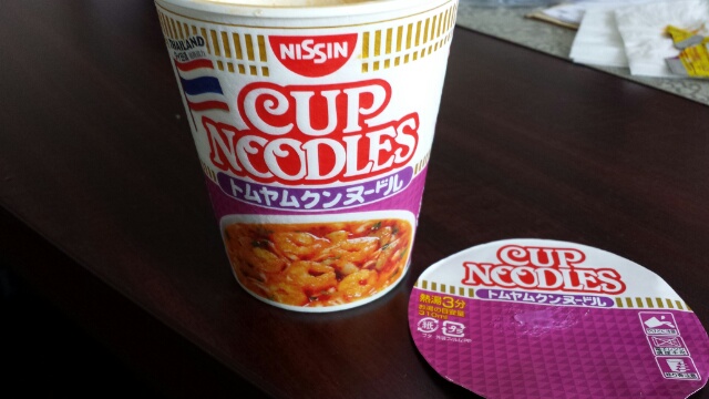 【PIC:今日のランチ。社員さんがセブンで見つけたよォー!って買ってきてくれた!そう、めちゃ食べたかったトムヤムクン味のカップヌードル!いけるっ!タイに行きたくなっちゃうやんかぁ】