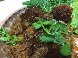 【PIC:かつめし作ってみた。牛肉のカツにデミグラスソースぶっかけ、パクチー載せ♪】
