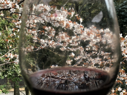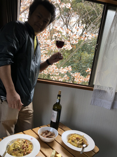 しっかし、桜が綺麗に咲いてるから花見したいなぁー?って2階に上がって窓を開けてみると、目の前に桜の木が!そう、ソメイヨシノではなく、山桜。そう、昔ながらの本物の桜!!!改良されて無いやつ!葉っぱも一緒に生えてくるヤツ。うれしいぃーーー!まさかこんなに近くで花見が出来るとは♪ランチにはパスタとワインで花見だーぃ!